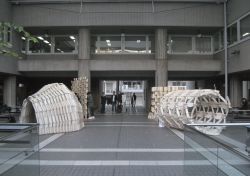 また、AAST国際ワークショップの作品も中庭に展示されました。これは、学生たちにより、アルゴリズミックな手法により設計され、フォーラムエイトのUC-win/Roadによる仙台駅周辺のVR空間内にモデルを配置してイメージ検討され、デジタルファブリケーション技術によって実寸製作されたものです。
