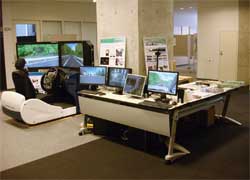 ディスプレイを3台使用するUC-win/Road Drive Simulatorの体験コーナーを用意して、講演の合間に訪れる研究者、技術者の方に試乗、体験していただきました。