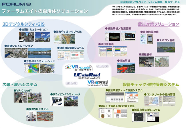 また、自治体ソリューションプレゼンでは神戸市や釜石市などの実例を紹介し、当社の震災対策・3Dデジタルシティなどの取り組みを紹介。これらの先進的な提案に対する需要可能性などについての関心やご意見もいただきました。今後はさらに、スパコンを使用した騒音解析やUC-win/RoadのCGムービーサービスなどのソリューションも積極的に展開していきますので、ぜひご期待ください。