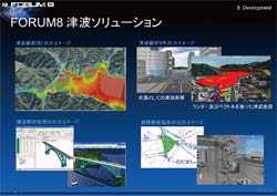今回は、東日本大震災の影響等もあり、津波解析シミュレーションに注目が集まっていました。具体例としては、UC-win/Roadとxpswmmを利用し、「今回の地震に対する防波堤の効果を解析したい」あるいは「防波堤の効果の検証と今後の対策について解析を行い、可視化し避難路等の検討や住民説明会などで活用したい」といったものです。