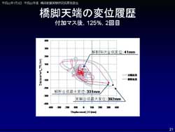 まず、本加振100%、2回目の橋脚天端での変位履歴です。本加振とは重量100%の状態を指しています。橋軸直角方向の最大値と、橋軸方向の最小値を記録した時間で解析と実験結果の違いがありますが、周期や振幅はよくあっています。橋軸方向の最大変位は約90mmで、柱基部から梁天端までの高さ7.5mの1.2%程度です。道路橋示方書で規定される許容残留変位は1%ですので、それとほぼ同等のレベルです。(図4)