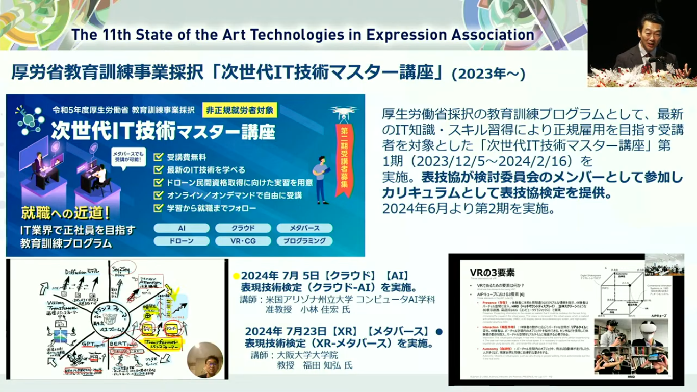 最先端表現技術利用推進協会(表技協)における、各種取組について紹介しました。表技協の活動目的、表現技術検定および表現技術検定公式ガイドブック「1日でわかるシリーズ」の紹介、掲載事例(デジタルツイン、メタバース、NFTなど)、協会への入会について紹介しました。