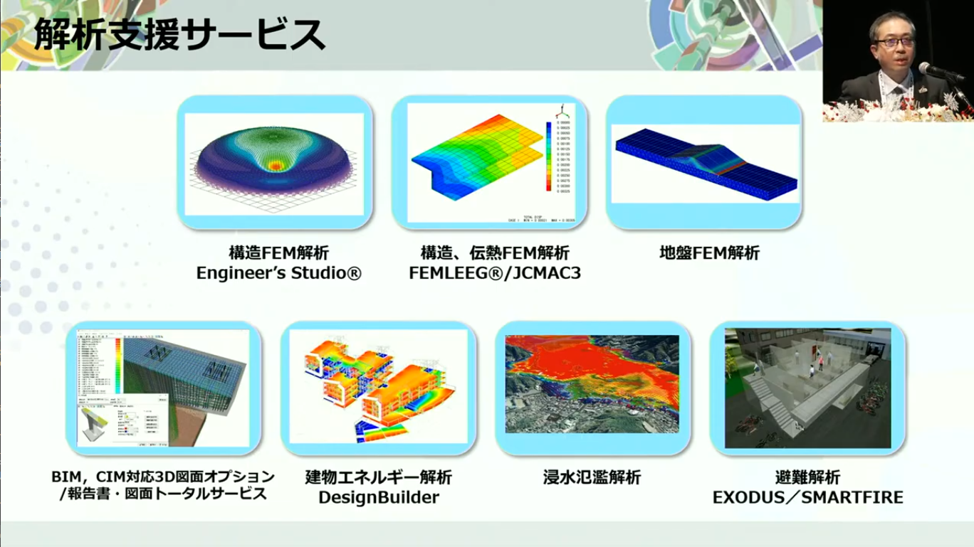 Engineer’s Studio®においてニーズが高いプッシュオーバー解析への対応やモデリングソフトShade3DとFEM解析ソフト(FEMLEEG®)連携をはじめ、業務の効率化に有用な構造・地盤のFEM解析ソリューションの新機能を事例を交えて紹介しました。また浸水氾濫をはじめとする各種災害シミュレーションを活用したリスクの評価、3DVRによるリスクの可視化・対策検討についても紹介しました。