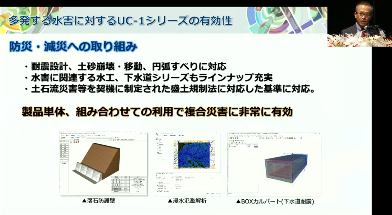 近年頻発する線状降水帯やゲリラ豪雨による水害への備えとして、河道の一次元不定流計算と氾濫原の二次元浸水氾濫解析により洪水浸水想定区域図が可能な新製品「浸水氾濫解析システム」をデモンストレーションを交えて紹介しました。また急速に進むAI・Cloud化に対応する最新情報として、全製品で対応を進めているF8-AI™ UCサポート/AI チャットでの設計サポート機能、UC-1シリーズの完全Cloud化第1弾となるUC-1 Cloud RC断面計算(旧基準)Complete、タブレット入力対応の橋梁点検支援システムについてデモンストレーションを交えて紹介しました。