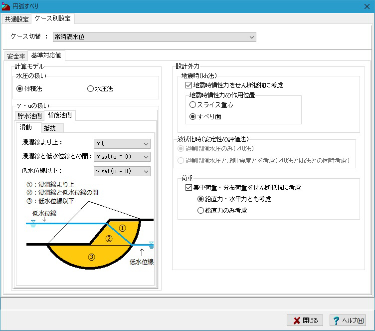 「初期値設定」入力画面|「基準対応値」タブ、および「円弧すべり」入力画面|「ケース別設定|基準対応値」タブの「γ・uの扱い」について、貯水池側と背後池側で異なる設定で計算が可能。 |