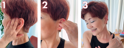 2 耳の穴を横に広げるように耳たぶを引っ張る。