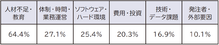 このほかにも、費用や環境整備の負担、日常業務に追われることや発注者との調整に時間がかかるといった体制面での課題も多く挙げられました。