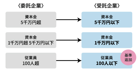 ③ 法適用基準の拡張(規制対象となる事業者の拡大) 従来の資本金基準に加え、従業員数による基準が追加されました。 ※プログラム作成委託・運送委託・倉庫保管委託・情報処理委託を含む ④ 手形払い等の禁止 従来は割引困難な手形の交付を禁止するにとどまっていましたが、通常の手形であっても受注者の資金繰りに係る負担が大きいことから、改正法では、手形払そのものを禁止しました(改正法5条1項2号)。 併せて、手形払以外の支払い方法(電子記録債権やファクタリング等)でも、支払期日までに代金額に相当する金銭(手数料等を含む満額)を得ることが困難であるものについては認めないこととされました。 これにより、製品や役務の受領の日から60日以内に現金で支払いが行われることになります。 おわりに
