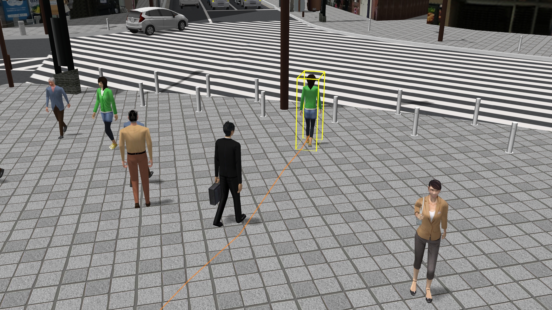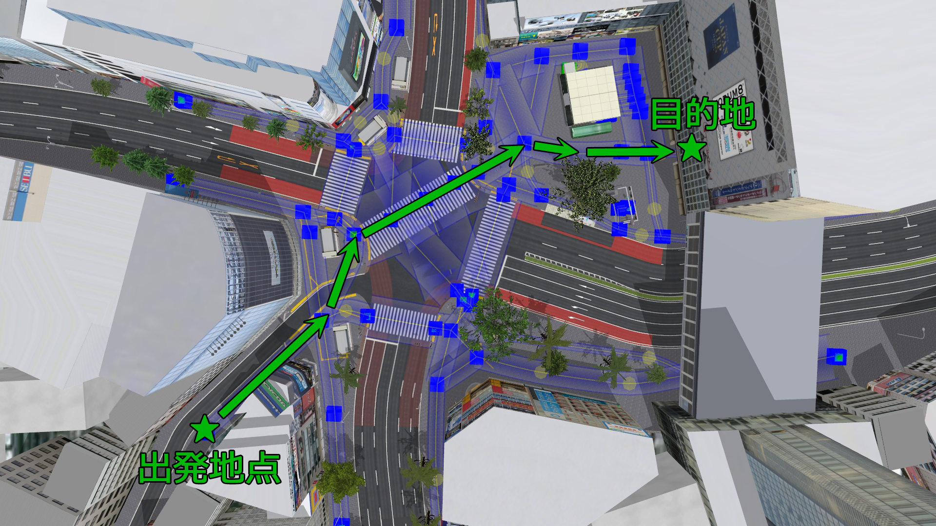 近年は、様々な方法で収集した人の移動の情報をビッグデータとして活用し、人流シミュレーションを行う事例が増えています。今回は、UC-win/Roadで人流シミュレーションを行う方法について解説します。 OD情報のみ存在する場合の人流シミュレーション 人の移動のOD情報(出発地点と目的地の情報)のみが存在する場合、歩行者ネットワークの機能を利用して出発地、目的地、移動人数を入力することで人流シミュレーションを行うことができます。人流の詳細な位置情報が存在する場合の方法は後述します。 歩行者ネットワークの作成 歩行者ネットワークは、幅を持たせた歩行ルート(パスウェイ)を空間上に引き、多数の歩行者を生成する機能です。歩道や広場などに面的にパスを引くことで人流をシミュレーションでき、ランダムな方向もしくはOD設定により目的地へ向かわせる動きを表現できます。作成するにはメニューバーの「編集」⇒「ネットワーク」⇒歩行者の項目で「新規追加」⇒ネットワークの項目で「新規追加」⇒パスウェイの項目で「新規追加」-「パスウェイ」の順に選択し、空間上にパスを引きます。 パスの端部にあたるノードには異なる複数のパスを接続し、広範囲の複雑な歩行者ネットワークを構築できます。パスの途中部分に接続したい場合は、途中の頂点をノードに変換することで接続が可能となります。パスを引いた後は、歩道や広場に合わせてパスの幅を調整します。混雑時は衝突を回避するために歩行者がパスからはみ出す場合もあるため、パスの幅は通行可能な幅よりも若干狭く設定してください。途中で道幅が変わる場合や障害物がある場合はパスを細かく分割し、場所ごとに幅を変えると良いです。 パスは進行方向を設定でき、片方向のみとすることも可能です。例えば左側通行の流れとしたい場合は、2本のパスを並べてそれぞれ逆方向の指定とすることで再現できます。また、フィルターを設定すると、事前に設定した属性の人だけが特定のパスを通らないようになります。 目的地の設定(OD設定) 新規作成した歩行者ネットワークは初期状態では歩行者がランダムに移動しますが、OD設定を行うことで特定の目的地に向かって移動する人流を生成することができます。出発/目的地はそれぞれネットワーク上のノード(「歩行者の発生・消滅」にチェックが入っているもの)を指定するので、ノードに個別の名称を入力しておくと便利です。OD設定への切り替えは「歩行者の生成」の画面でタイプをNormalからODマトリックスに変更します。 ODマトリックスでは指定可能な2点のノードを指定し、2点間を移動する人数の初期値、最大値、単位時間ごとの発生人数等を指定できます。目的地へのルートは最短経路が基本となりますが、混雑状況やエスカレータ等の利用の嗜好性によって変化する場合もあります。 歩行者属性設定 パス上を歩く歩行者は、キャラクタの種類ごとにカテゴリの区分を行うことで、移動速度などの特性やルート選択の嗜好性などを表現できます。カテゴリごとに、階段・エスカレータ・エレベータの選択嗜好性、一人あたりの専有面積、平面/階段/エスカレータの歩行時速度、エスカレータの歩行割合などの設定が可能で、カテゴリ自体も追加可能です。 この設定を応用すると、例えば雨天時の想定でシミュレーションする場合に、専有面積を広めに設定して移動速度を遅くすることで、歩行者が傘をさしている場合の人流を表現できます。その際、歩行者プロファイルで傘をさしているキャラクタを選び、描画オプションで雨を降らせると、よりリアルな見た目となります。 階段/エスカレータ/エレベータ設定 人流を再現するルート上に階段やエスカレータがある場合、まず階段やエスカレータに沿ってパスを引きます。その後、タイプの設定を階段もしくはエスカレータに切り替えることで、歩行者の挙動がそれぞれに適したものとなります。階段の場合は移動速度を落とすことができ、エスカレータの場合は立ち止まったまま指定の速度で移動するほか、立って乗る人と歩く人の割合を指定して表現できます。 エレベータの場合は、3Dモデルと連動させて表現します。ドアの開閉を表現した3Dモデルを配置し、ノードのスケジュール設定でモデルの割り当てと開閉コマンドの指定を行うと、エレベータで接続された2つのノード間の移動が表現されます。ドア周辺にはノードの待ち行列機能で行列の並び位置を引くことでエレベータ待ちの行列が再現されます。 移動経路の座標情報が存在する場合の人流シミュレーション 各個人の移動経路が座標情報として記録されている人流データがある場合は、CSVに書き出すことでマイクロシミュレーションの機能で人の動きを再現可能です。その場合、歩行者ネットワークの構築は必要ありません。 ■人流の読み込みに必要な要素設定 人流データの中に以下の要素が揃っている必要があります。その際、時間情報や位置情報は個人I