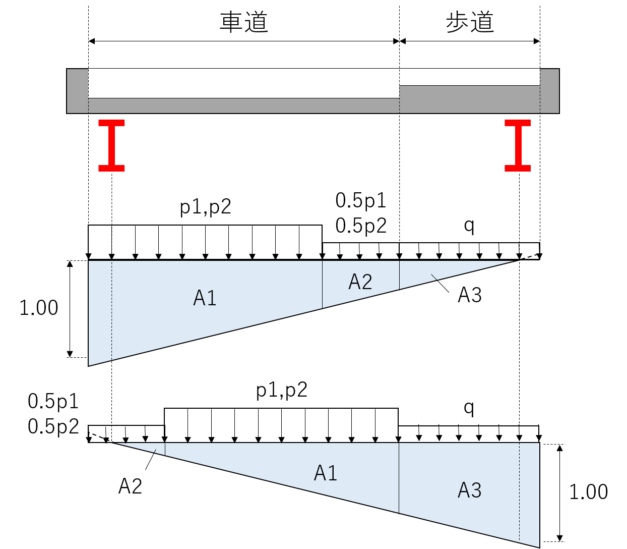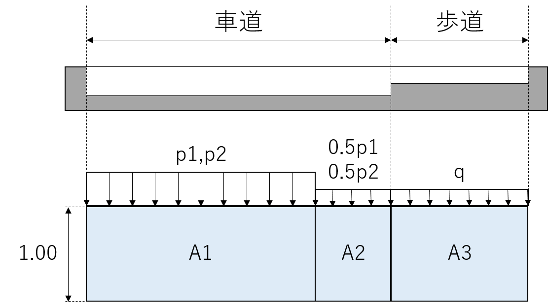 FRAMEマネージャのIL計算では、上部構造を1本の棒部材とみなした橋軸方向の影響線解析が可能です。1本の棒部材に置き換える場合、活荷重の影響面積には一般的に(影響面積)=(載荷幅)×1.0で計算した値を入力します。しかし、上部構造が2主桁で片方の主桁のみ設計するような場合には、設計したい桁に着目した影響面積を算出する工夫が必要となります。 影響面積について 影響面積は活荷重を載荷する位置の横方向(橋軸直角方向)の幅を定義するデータです。車道幅員のうち主載荷幅(5.5m)に相当する部分を「主載荷荷重影響面積」、従載荷幅(5.5m以外)に相当する部分を「従載荷荷重影響面積」、歩道幅員に相当する部分を「群集荷重影響面積」に入力します。 1つの棒部材に置き換えて影響線解析を行う場合 橋軸直角方向の影響を考えず、1本の棒部材に主載荷荷重、従載荷荷重、群集荷重をそのまま作用させる場合、橋軸直角方向の影響線は図2のように考えることができます。この場合は、各荷重が載荷される幅員を影響面積として入力することになります。 2主桁で片方の主桁のみ設計する場合 上部構造が2主桁で片方の主桁のみ設計する場合、橋軸直角方向の影響線を図3のように考えて各影響面積を算出し、本製品に入力します。このとき、設計する主桁にもっとも不利な応力が生じるよう主載荷荷重の載荷位置を決める必要があります。 多主桁で構成される場合 上部構造が多主桁で構成される場合、橋軸直角方向の影響線の形状は橋軸方向の各位置で異なるため、格子解析等を用いる必要があります。弊社別製品「任意形格子桁の計算」のご利用をご検討ください。 |