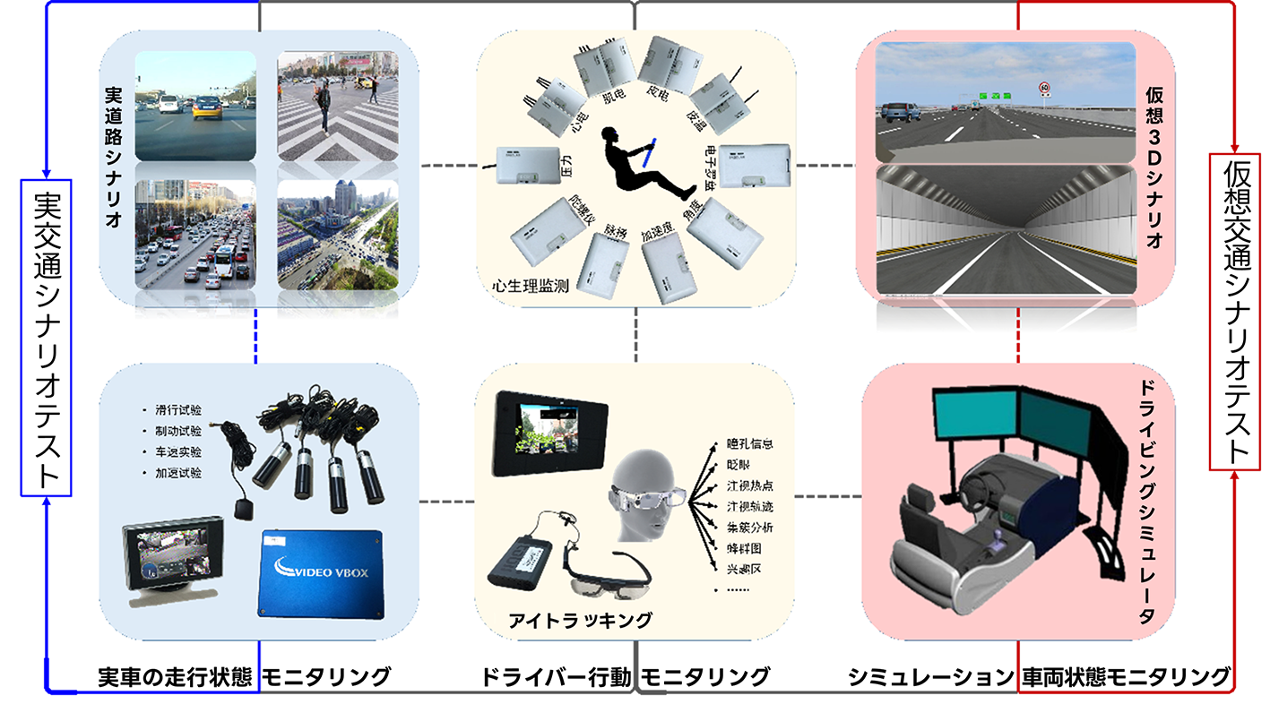 | 実交通データと仮想シミュレーションを統合し、運転行動と車両状態を多角的にモニタリングする研究プラットフォーム |