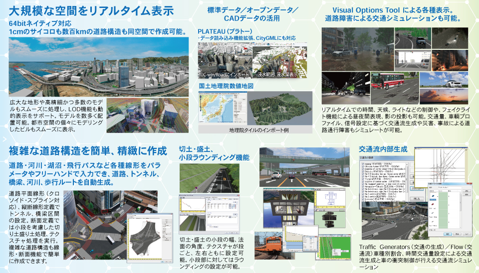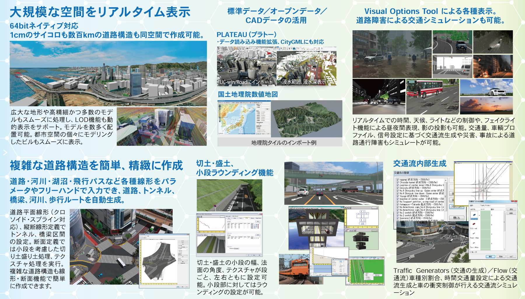 3次元リアルタイム・バーチャルリアリティソフト UC-win/Road は、各種プロジェクトの3次元大規模空間を簡単なPC操作で作成でき、多様なリアルタイムシミュレーションが行える先進のソフトウェアです。柔軟な開発環境、高度なシステム開発に適用できます。