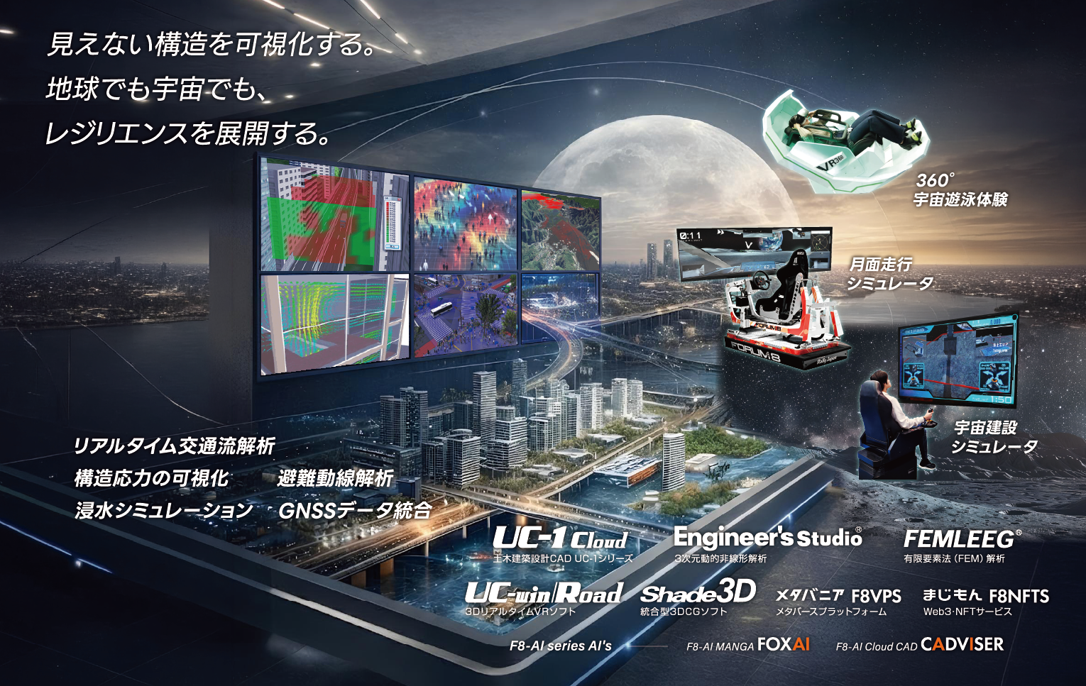 「FORUM8 — Experience the Moon. Design the Future.」をテーマに、防災・環境・社会インフラに貢献するJapan-madeエンジニアリングソフトウェアと、その中核を成すミドルウェア型システム基盤を発表します。