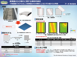 側溝蓋は平板状の構造をしており、鉄筋配置が格子状に配筋されている。車輪等が格子の配筋状態に対して斜方向に進入した場合、引張側の断面力に対して、実際に抵抗する配筋が斜め方向の抵抗力となり、ひび割れが発生しやすくなるものと考えられる。