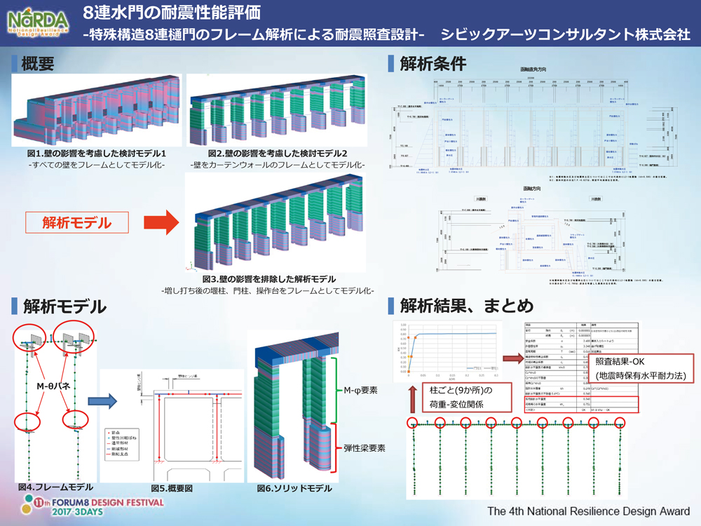 8連樋門の上に車道が設置され、既存の堰柱や門柱部も増し打ちされた特殊な構造の耐震計算。壁の影響を考慮した場合と影響を無視した場合を3次元FEM解析ソフト「Engineer's