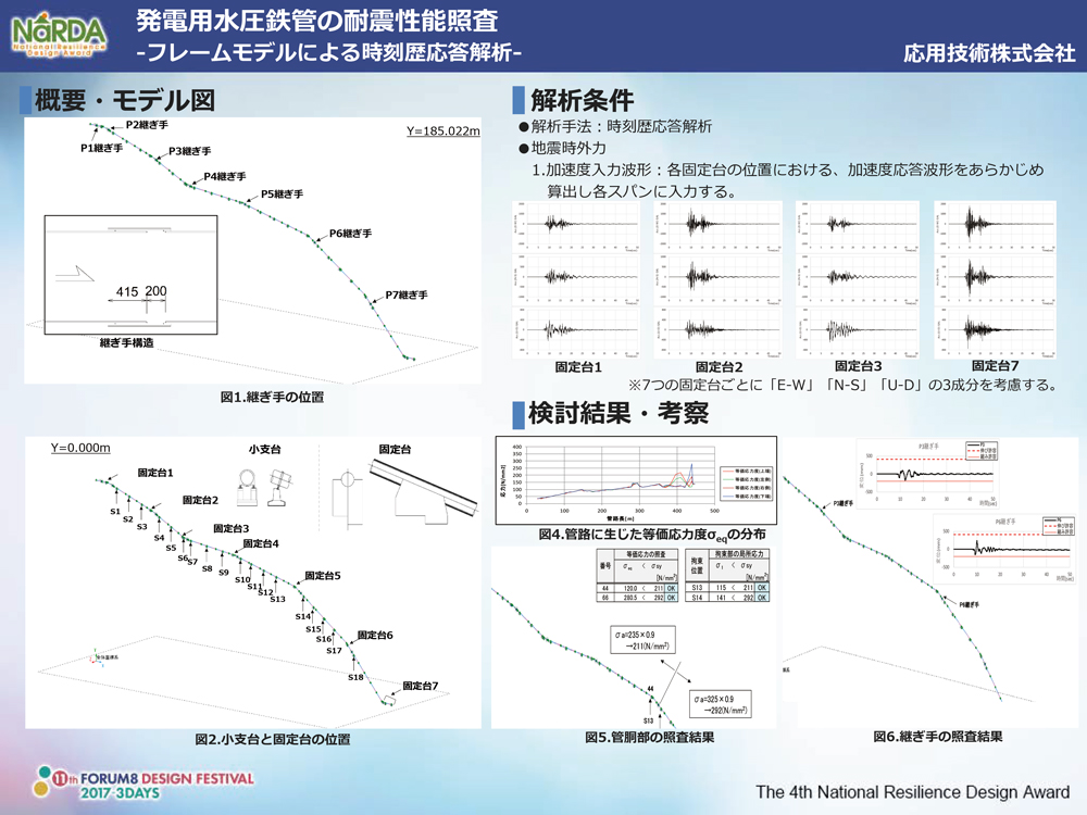 本件事例は、露出型水圧鉄管の耐震性能を動的解析により評価するものである。解析には、前もって算出した固定台位置ごとの加速度波形を入力条件として使用する。管胴部及び継ぎ手の発生応答値より、耐震性能を満足することを確認した。