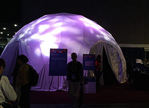 VR村の展示には7m x 7mの仮設ドームが設置された。ドーム内部では4Kのプロジェクターに魚眼レンズを利用した半円ドームが利用された。通常プラネタリウムなどの大きなドームでは複数プロジェクターを利用するが、設置時間の制約にために最もシンプルなシステムを採用したと、セッション・チェアが説明してくれた。来年も同様の展示があれば、おそらく4Kのドーム型ファイルでの一般公募となると思われる。(画像7・8)