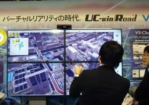 当社は「バーチャルリアリティの時代 UC-win/Road® VR-Cloud® 3D・VRを実現した先進のクラウドサービス」をテーマとして掲げ、UC-win/Roadで作成したVR空間をシンクライアント端末で高速描画させるVR-Cloud®を小型高性能グラフィックサーバーのUMDCを複数台使用した環境にて体験いただきました。3D対応HMDのOculus