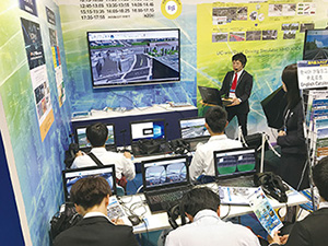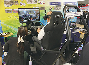本年フォーラムエイトは「バーチャルリアリティの時代UC-win/Road®〜ITS, ADAS, 自動運転シミュレーション〜」をテーマに掲げUC-win/Roadをプラットフォームとした様々な自動車に関するシミュレーションシステムを展示、提案いたしました。特にHMDを活用した展示が好評で、その中でも新たな展示として、6軸のモーションを搭載した大型ドライビングシミュレータと共にHMDを装着するシステムを展示し、モーションとHMDのコンビネーションとUC-win/Roadの連携に感心の声を多くいただきました。また、新たに標準プラグイン化するHTC