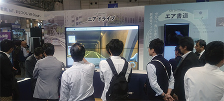 弊社ブースでは、「バーチャルリアリティの時代UC-win/Road 〜AR/VRが創るイノベーション〜」をメインテーマとして、UC-win/Roadを活用した多数のシステム展示を行いました。ドライブシミュレータ、鉄道シミュレータ、自動車シミュレータといったシステムを、ハンドル、マスコンなどの実際の操作デバイスで体験いただき、来場者の関心を集めました。