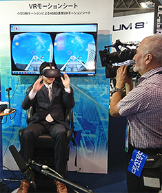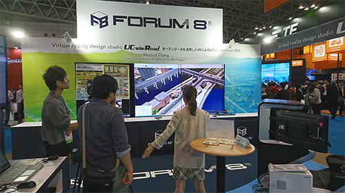 フォーラムエイト出展ブースのテーマは「VR-Design Studio UC-win/Road〜オープンデータを活用したVRによるIoTシミュレーション環境〜」。クラウド上のVRにあらゆるデータ・情報を付与して広く活用できる新たなVRプラットフォームをはじめとして、基盤地図情報や全世界のオープンデータを活用した迅速な大規模VRシミュレーション空間構築、モーションキャプチャ・測位情報などのセンサーデータ活用システムなど、多様なソリューションを展示しました。