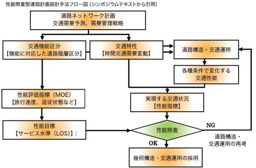 最初のディスカッションテーマは、道路計画・設計分野での「性能照査型設計」導入についてでした。従来の道路設計では、道路構造令に計画交通量を適用して道路構造を決定する「仕様設計」であり、地方の特徴を考慮するなどの柔軟性に欠ける面がありました。ここでは、「機能に応じた性能」を性能目標に、道路構造と交通運用を柔軟に組み合わせて設計する手法の必要性が述べられました。この際、性能目標と性能指標をどのように設定するかが重要な課題であると感じられました。