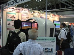 弊社ブースではUC-win/Road マイクロシミュレーションプレーヤー、エコドライブ・プラグインを中心に展示すると供に、3画面6軸モーション対応ドライブシミュレータの運転体験、UC-win/Roadによる3次元VRソフト操作体験コーナーを設置し、多数の来場者に体験していただきました。当社では、交通シミュレーションなどのシミュレーション結果を利用できるマイクロシミュレーションプレーヤー、エコドライブプラグインに