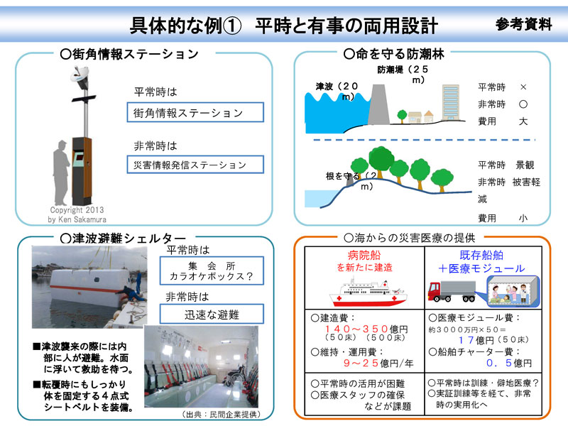 - 平時と有事の両用設計(街角情報ステーション、津波避難シェルター、命を守る防風林および海からの災害医療の提供)