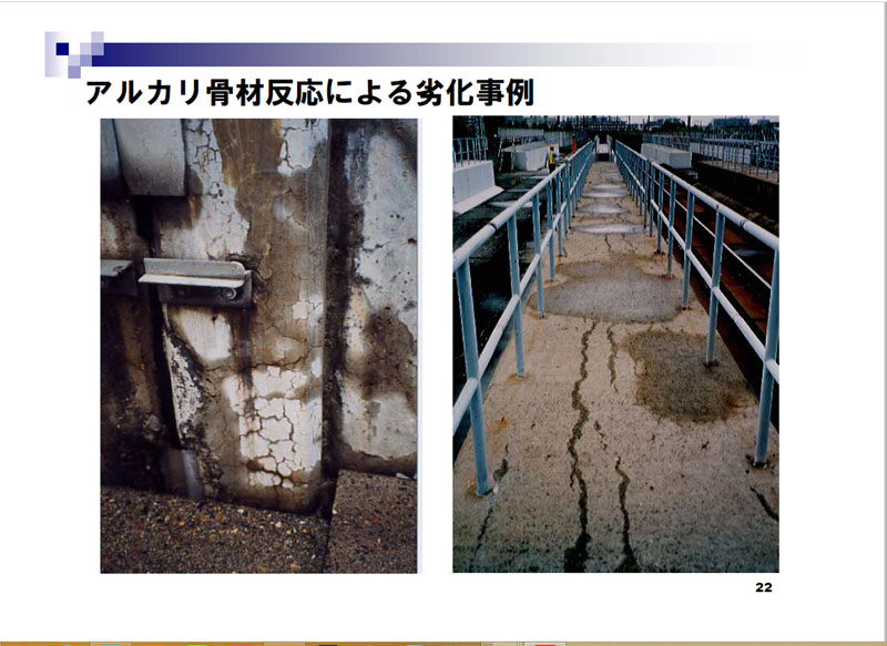 午後の部の最初は、ジェイアール東日本コンサルタンツ株式会社取締役会長、東日本旅客鉄道株式会社顧問、早稲田大学客員教授の石橋忠良氏が「メンテナンスからの情報が構造物の長寿命化を可能とする」と題して特別講演。明治時代以降に建設され、今日なお使われているJR在来線の鉄道橋やトンネルなど複数の鉄道構造物を列挙。それらの経年と、時代を反映して使われている鋼材やレンガ、コンクリートなど各種材料に触れながら、変状の原因はそれらよりもむしろ施工時の管理や建設時の技術的な問題が大きいとの見方を提示。それを受けて、検査に関する基準の変遷に触れます。その上で、近年問題になっているコンクリート片の剥落に焦点を当てその原因、既設構造物への補修や新設構造物の品質向上策を整理。さらにアルカリ骨材反応、塩害、凍害などによる損傷と各種補修対策、地震災害と対策などに言及。これらを基に、1)維持管理におけるトラブルの情報から設計・施工の技術基準などを速やかに変更する必要、2)多くの変状構造物を扱い続けると見るだけで原因や対策が判断可能、3)建設年の施工方法や設計基準からその時代の欠点を想定可能