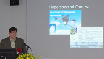 | ジョージア工科大学教授 マシュー・スワート氏は、「ドローンを利用したVR地形作成」と題したプロジェクトを紹介。建物や空間の持つ目的や機能だけでなく、それらがもたらすソーシャリゼーションや心理的な影響に注目して、実際の安全性ではなく「安全に感じられる」という認識を、空間に対して人間がどのようにもつかを調査するにあたって、VRを活用しました。地形の作成には、ドローン(ファントム3)にGoProを装備してパノラマ撮影を行った写真データを利用。また、計画協議において効果的な対面コミュニケーションを行うために必要なデバイスおよび方法についての検証では、タブレットによるAR、ヘッドマウントディスプレイ、投影によるフィジカルコンピューティングなどの比較を行って、関心を集めました。 |