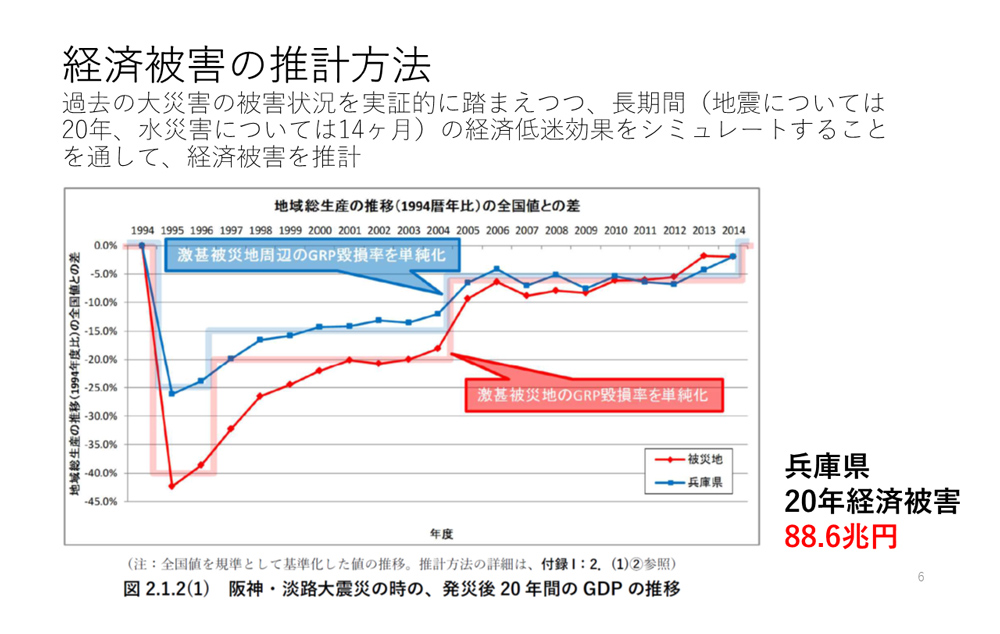 続いて「巨大災害はどれくらいの被害をもたらし、何でどれくらい軽減できるのか?」と題し、京都大学大学院工学研究科・レジリエンス実践ユニット長の藤井聡教授が特別講演。南海トラフ地震が発生したら実際にどのようなことが起こるのか世の中でほとんど認識されていない、という危機感から自身が働きかけて前年度1年間にわたり取り組み、2018年5月に土木学会が公表した「『国難』をもたらす巨大災害対策についての技術検討報告書」をベースに解説。まずポルトガルの国力衰退の一因ともなったリスボン大地震(1755年)、パキスタンからバングラデシュを分離させるほどの大混乱を国家にもたらしたボーラサイクロン(1970年)、倒幕の隠れた要因ともなった幕末・安政の複合災害(1854〜1856年の東海・南海地震、江戸地震および江戸暴風雨)など、巨大災害が国の歴史を変えた例を列挙。ただでさえデフレやマイナス成長が続き経済力にかつての勢いがない中、数十年前に建設され劣化したままの橋梁などのインフラも多く、これに巨大災害が生じれば日本がアジアの最貧国ともなりかねないとの観点を提示。そこで同氏らは、南海トラフ地震や首都直下地震、大都市河川の大洪水などが起きた場合も致命的な事態を回避し、回復可能な範囲にとどめ得る対策について検討。その一環としてまず、阪神・淡路大震災(1995年)など過去の大災害発災後のGRP(域内総生産)の推移などを基に長期間(地震:20年、水災害:14カ月)に及ぶ経済低迷効果をシミュレーション。併せて、土木学会が別途構築した推計手法を用い、想定される各巨大災害による経済被害や資産被害などを推計。例えば、南海トラフ地震が発生した場合の20年間にわたる経済的な被害が最悪1410兆円に上るとし、内閣府が公表してきた被害推計(建物被害として170兆円)より一桁大きな数字が示された、と言及。それに対し、徹底的な強靭化策(土木対策や建築対策など)を早期に行っておけば上述の被害推計より3〜4割減災することは可能。すなわち、強靭化のための投資はそれ以上の財政的な恩恵をもたらす、との考え方を説きました。