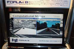 一風変わった技術紹介となったManga-Meは、フォーラムエイトWorld16メンバーである香港中文大学のMarc氏とYingge氏によって開発されたテクスチャ変換技術で、写真や画像をマンガ風タッチの画像に変換するものです。現在iPhoneアプリとして無料で公開されています。フォーラムエイトではこの技術をUC-win/Roadのプラグインとして実現する開発を進めています。体験コーナーではその場で撮影した自分の写真をマンガ風タッチに変換して印刷してお持ち帰りいただくサービスを行ったほか、UC-win/Roadによるマンガの世界のドライビングを体験していただきました。