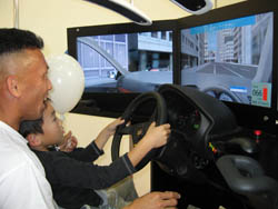 弊社では、UC-win/Road体験シミュレータを展示し、延べ500名を超える来場者の方々にご体験いただくことができました。一般の家族連れの方々が多く来場され、UC-win/Roadの多彩なVR技術を利用したドライブシミュレータ環境でドライブシミュレーションをお楽しみいただき、大変好評でした。