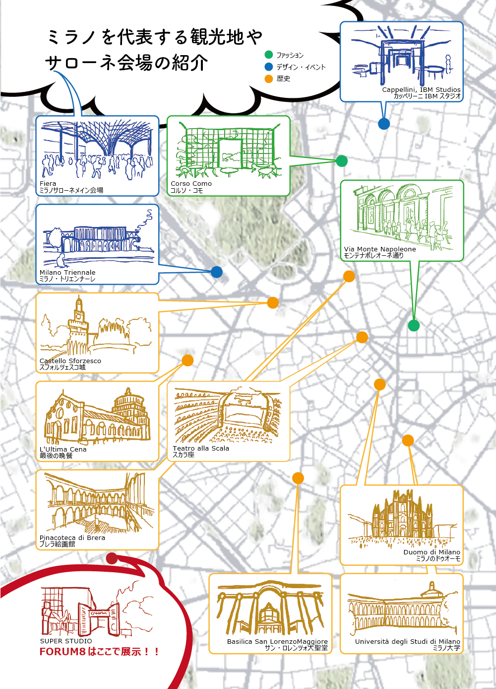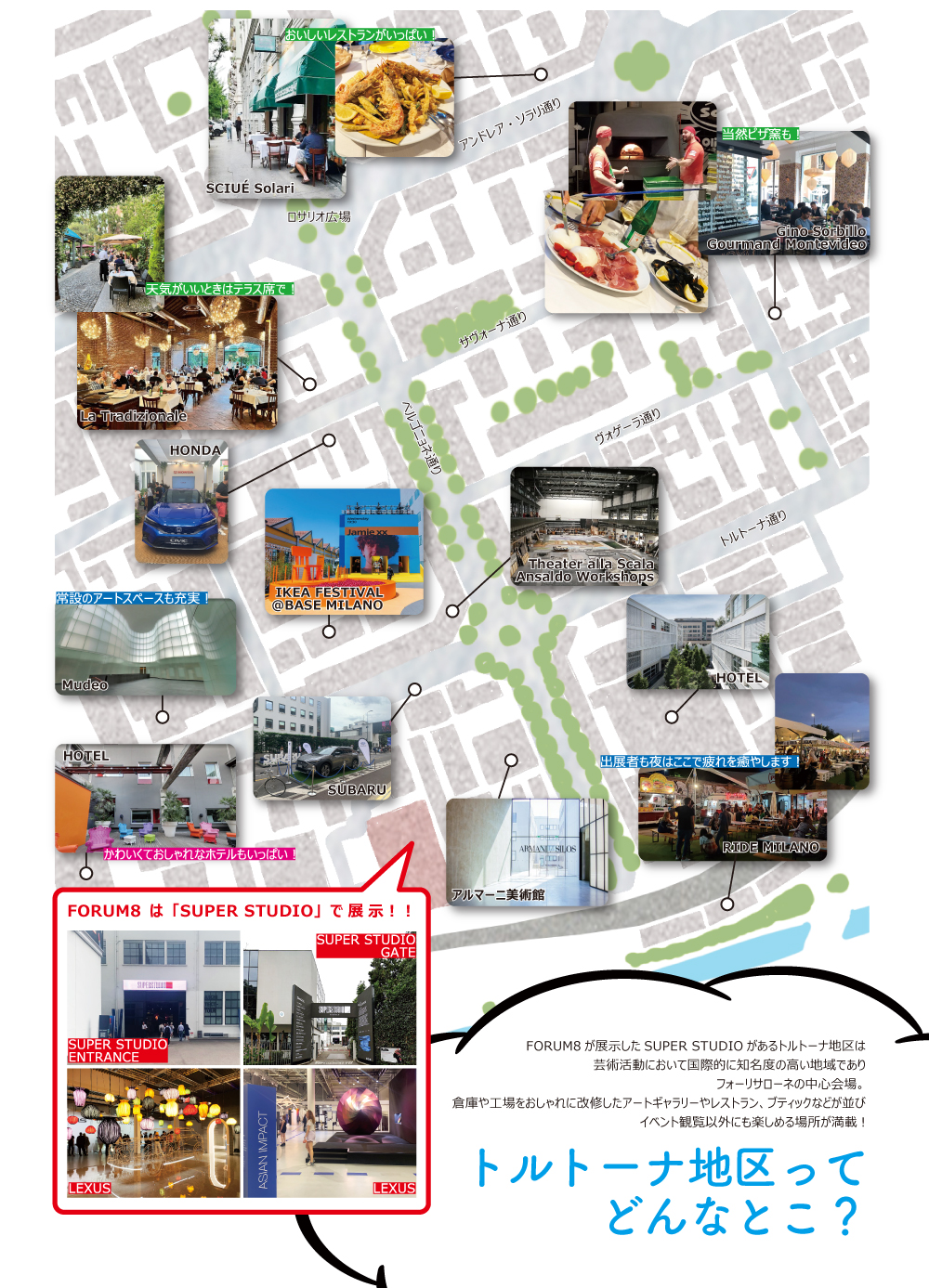 今回FORUM8が出展したSuperstudio会場は、ミラノ市内に点在する様々な会場が舞台となるミラノ中心街全体で繰り広げられるデザインのお祭り=フォーリサローネの中の最も重要な会場です。展示は家具だけでなくテクノロジー・アート・ファッションなど多岐にわたります。ルイ・ヴィトンやプラダといったメゾンから、レクサスなどのメーカーがしのぎを削ってアピールします。FORUM8はその中の1社として出展しました。