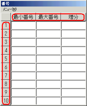 右のシートの場合、[最小番号][最大番号][増分]ボタンをクリックしますとそれぞれの列のセルがクリアされます。
