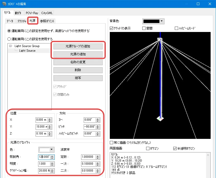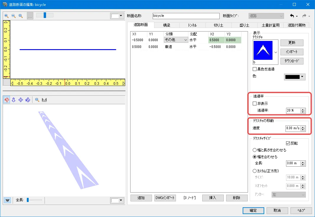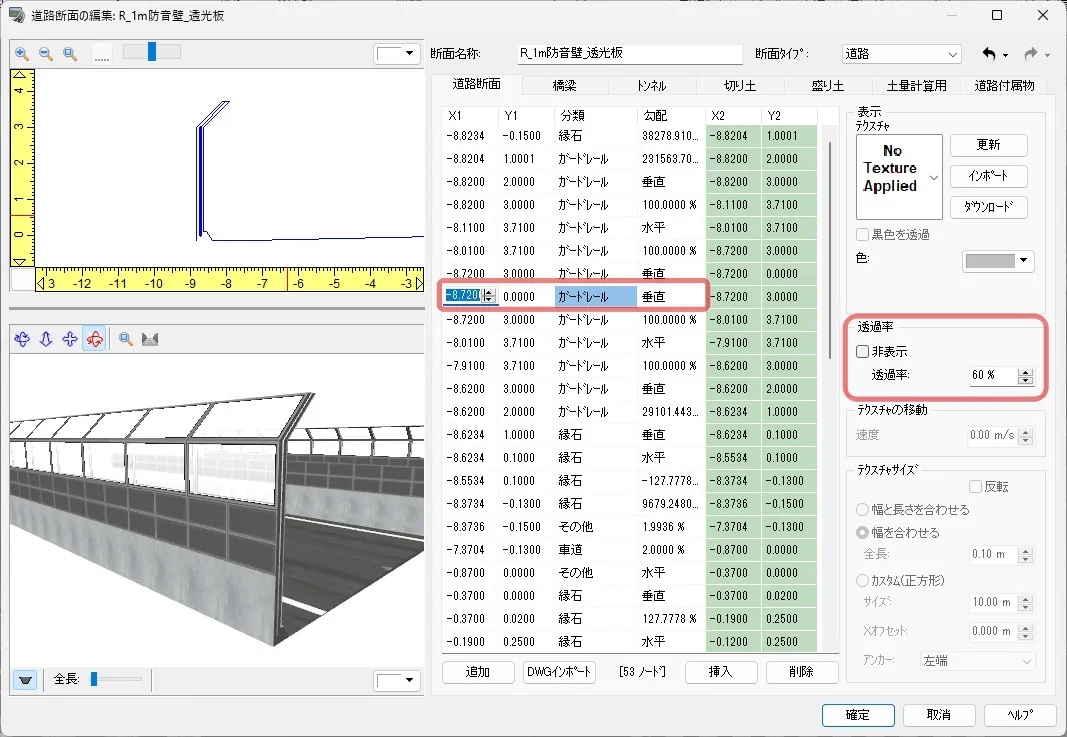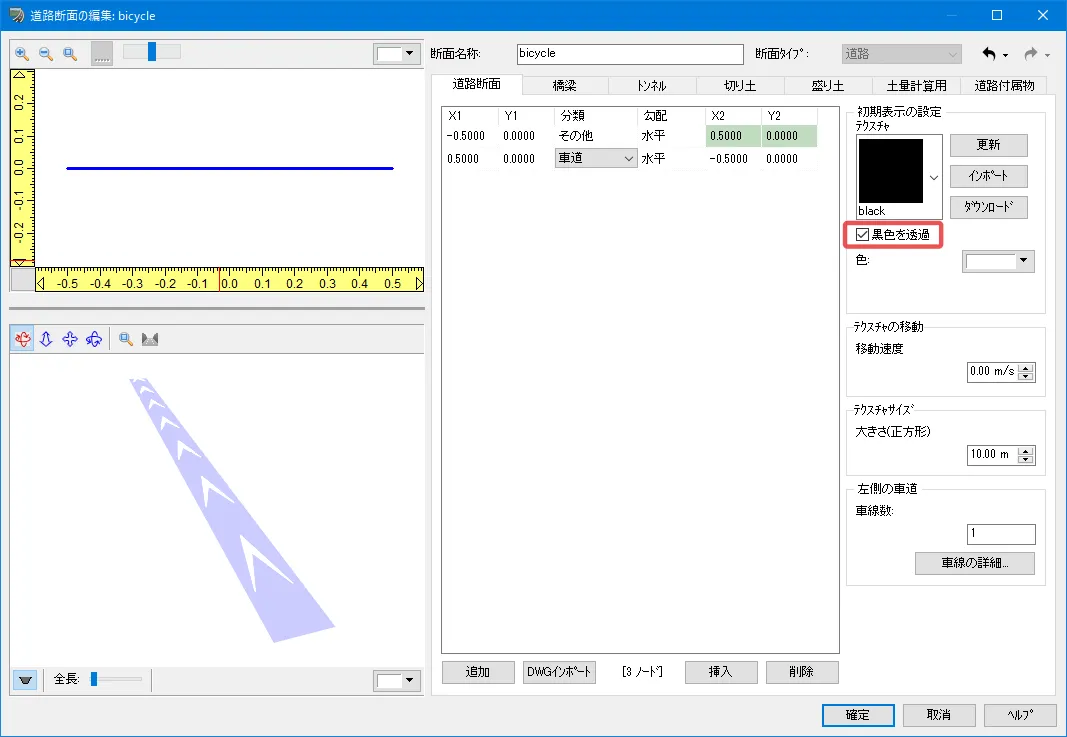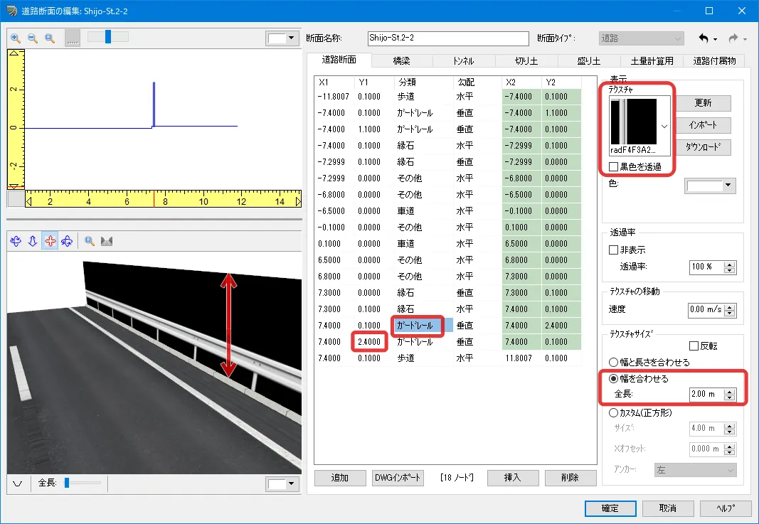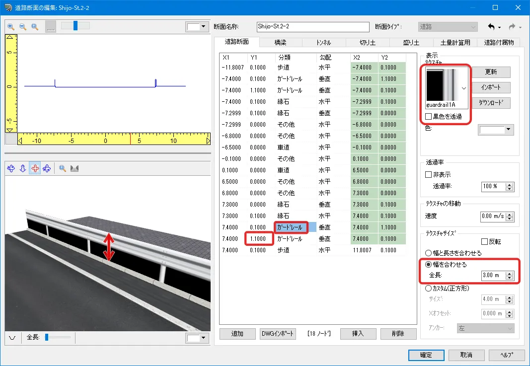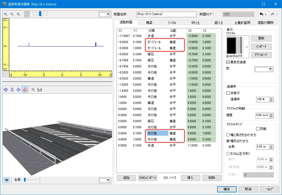 定義した面(ノード)は片面だけ表示されるため、例えばガードレールなどは左側と右側の両面を設定する必要があります。ノードの選択は、左上の断面をクリック、またはリストの行をクリックして選択します。ノードの「分類」によって右サイドの設定項目が変わります。ガードレールなどのテクスチャは黒色部分を透過させるため「黒色を透過」にチェックを付けます。