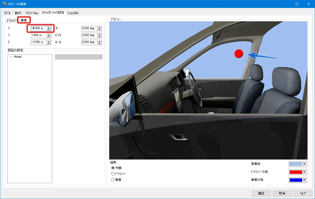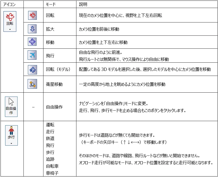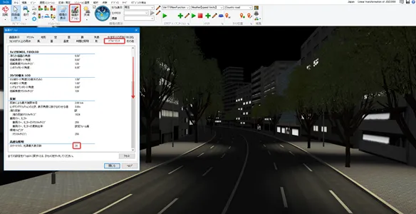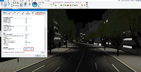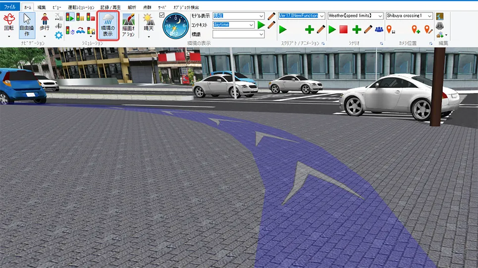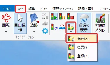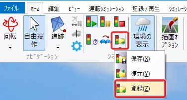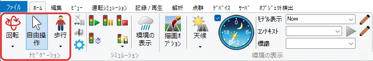 メニュー「ホーム」で「歩行」(左から2番目の「自由操作」の右側にあるボタン)をクリックして「走行」を選択します。「運転走行の設定」画面で作成した道路を選択して「確定」します。初期速度を設定した場合は走行開始します。初期速度0km/hの場合は停止した状態になります。走行開始したい場合はキーボードの矢印キー[↑]で速度が上がります。走行を停止する場合はメニュー「自由操作」ボタンをクリックします。