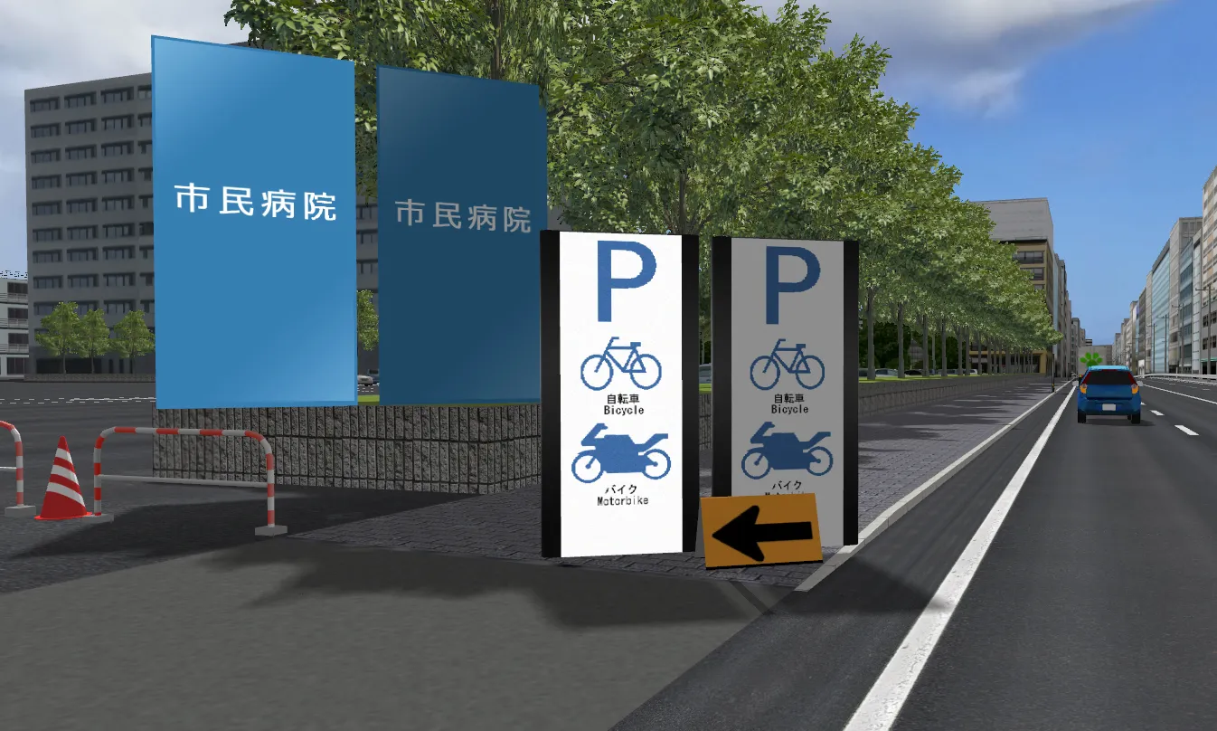 視点に近すぎたり背景の端が見えたりすると、板状であることがわかり違和感が生じるため、道路脇などには設置しないようにしたり、視点と背景の間に樹木を適宜配置したりします。