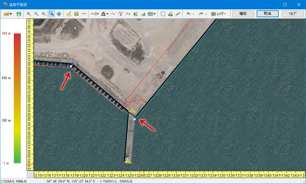 画面の左上に「第1地点の選択...」というメッセージが表示されるので、測りたい2点の1点目を左クリックします。画面左上に「第2地点の選択...」と表示されたら、2点目を左クリックします。1点目と2点目の間に赤いラインが表示され、画面の左上には、起点、終点、距離、水平距離、垂直距離が表示されます。