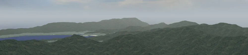 遠景の山なみなども視点場から見える標高が高い領域を含めて地形生成を行うことにより、移動景観上でもリアルな地形を表現することができます。