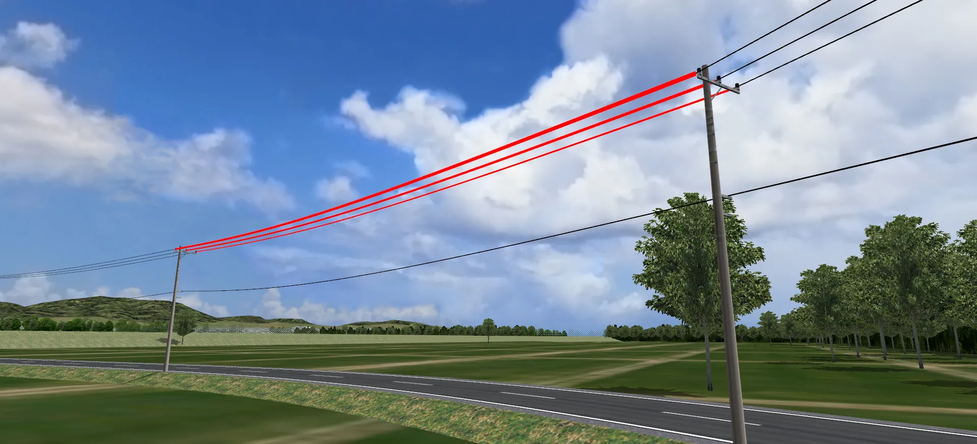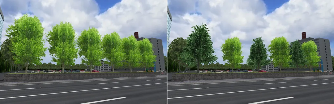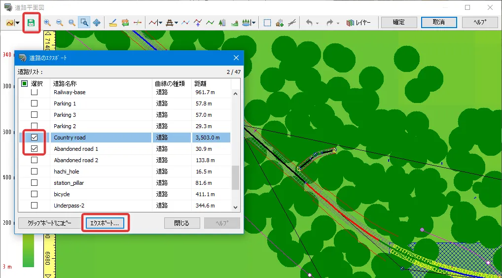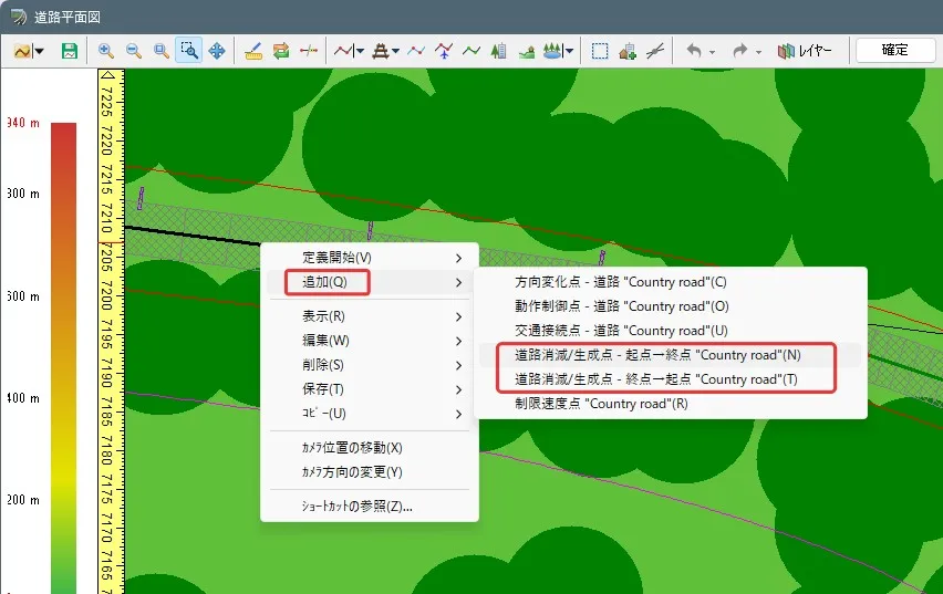 山間部の道路で周囲の森林を表現する場合、全ての樹木を道路付属物や森林生成などで配置すると樹木数が膨大になるため、「背景」で樹々を表現する方法があります。道路に近い箇所には樹木を配置し、その後ろや遠景に「背景」を設置します。