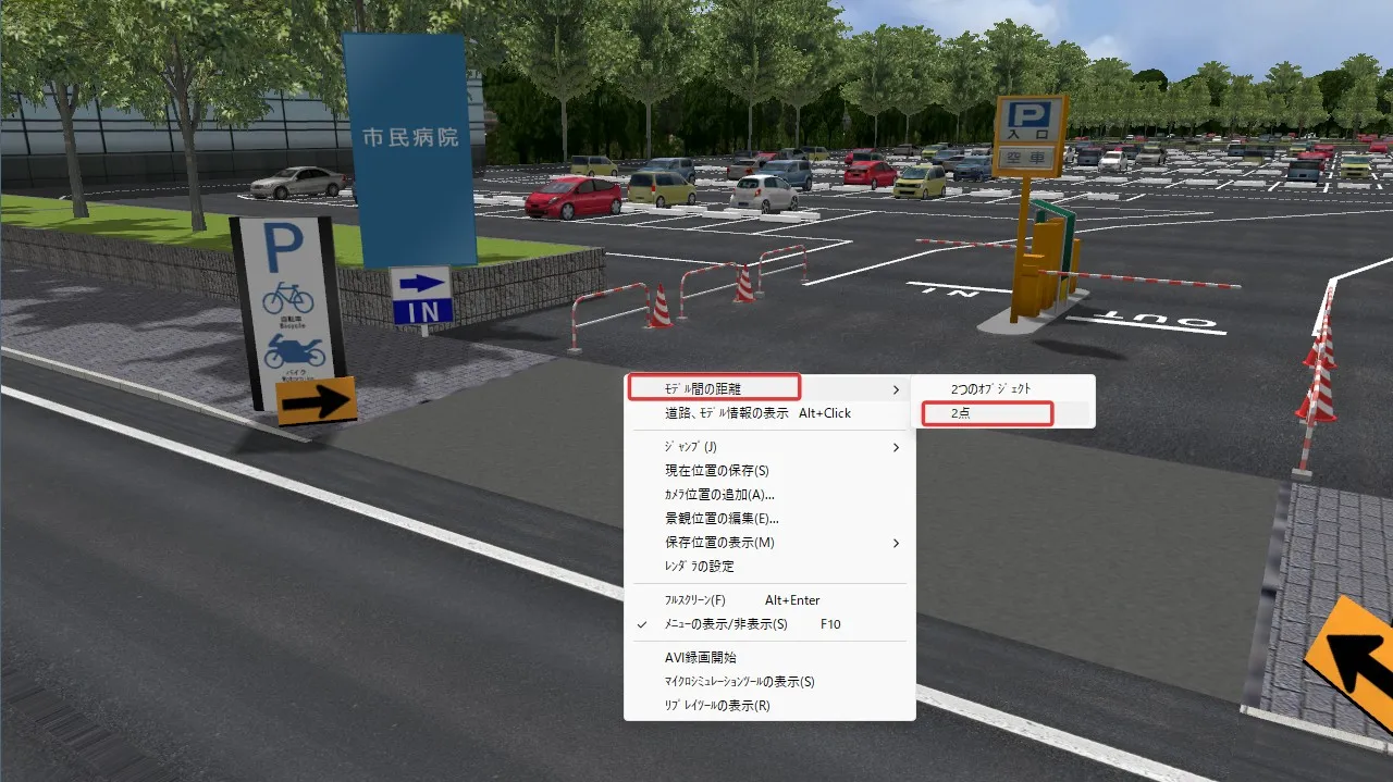 2点間の距離を知りたい場合は、右クリック「モデル間の距離」-「2点」を選択します。