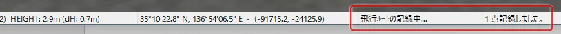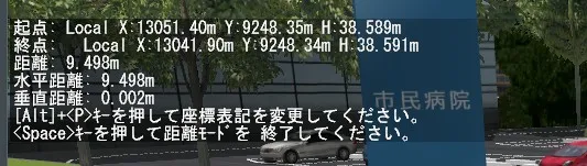 ここで、[Alt]+[P]キーを押すと、起点(第1地点)と終点(第2地点)の位置情報がローカル座標、グローバル(世界測地系座標)、日本測地系座標、緯度経度DMS、緯度経度DD、と押すたびに表記が入れ替わるため、距離だけでなく位置情報を知りたい場合にも使えます。