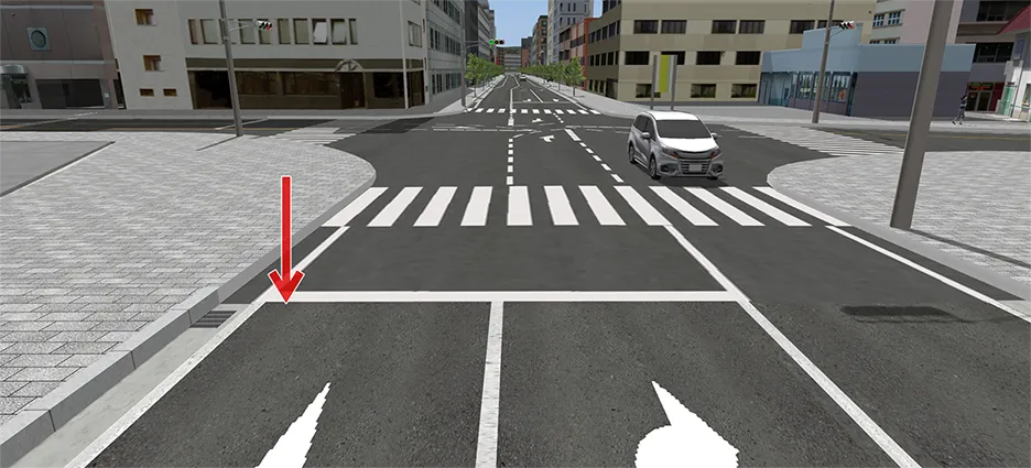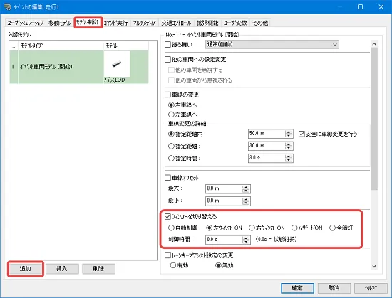 「交通コントロール」タブで左折可とする走行ルートを選択し、右側のメニューの「上書きする」にチェックを入れ、「制御しない」を選択します。選択した走行ルートのみ信号による制御から外れて、赤信号でも車が左折します。「停止する」を選択すると停止ポイントで一時停止するため、必ず一時停止させたい場合はこの方法をとります。この設定は「交通コントロール」タブで走行ルートを選択しないと設定が確認できないため、注意が必要です。
