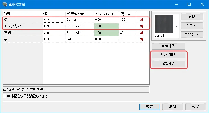 外側線などは「端部」で、車線間の区画線などは「ギャップ」で設定します。「車線の詳細」画面の最下部の「端」は端部が無くても削除せず0.0m幅で定義を残しておくと、必要になった際に追加しやすいです。