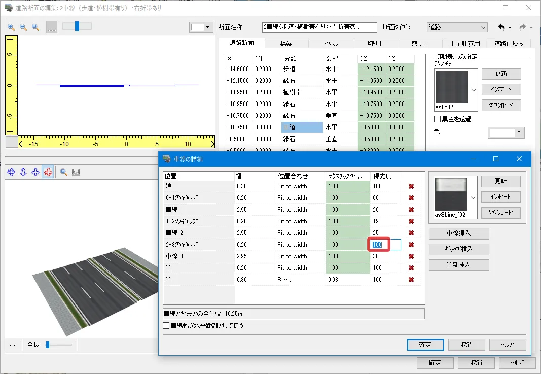 車道内の詳細な編集は、上記「道路断面の編集」画面で分類「車道」のノードを選択して「車線の詳細」で設定します。車線の幅や舗装の種類、ライン(区画線)の色や幅などを編集することができます。
