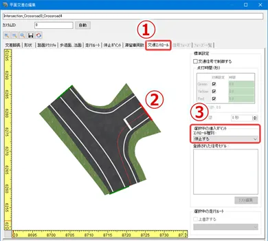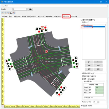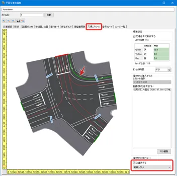赤信号でも左折できる常時左折可の進入路を設定する方法は3種類あります。いずれも、交差点構造や信号フェーズを設定した後、「道路平面図」の交差点の編集画面で行います。