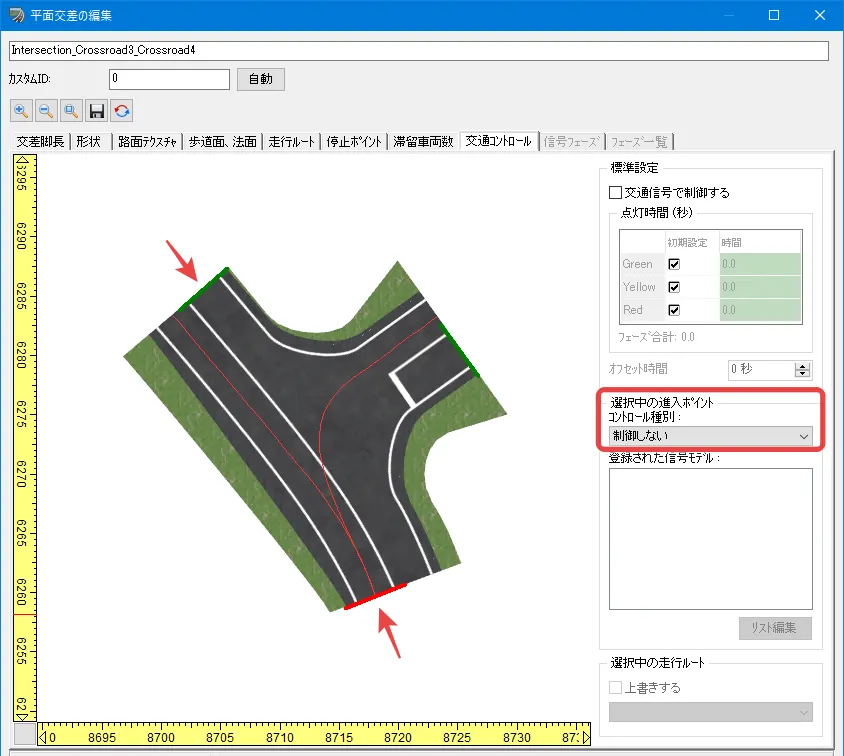 このようにウィンカーの動作を初期設定から変更したい場合は、交差点の編集画面で設定ができます。編集画面の「走行ルート」タブで、変更する走行ルートの根元にある進入ポイント(緑色の矢印)をクリックし、右側の「方向」タブで進出ポイントの方向を変更します。この場合、右に進むルートが初期設定では「右」となっているため、「直進」に変更します。これで、下から右へ進む車はウィンカーを出さなくなります。