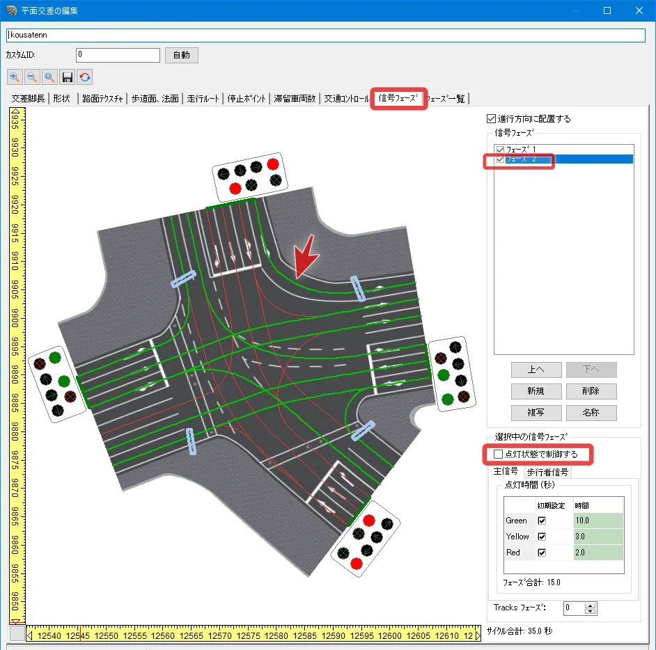 「信号フェーズ」タブで左折可の道路が赤信号となるフェーズを選択し、「点灯状態で制御する」のチェックを外します。信号機モデルはフェーズの設定通りに点灯しますが、走行ルートごとに個別に赤と青の設定を行うことができます。左折の走行ルートをクリックし、色が赤から緑に変われば設定完了です。