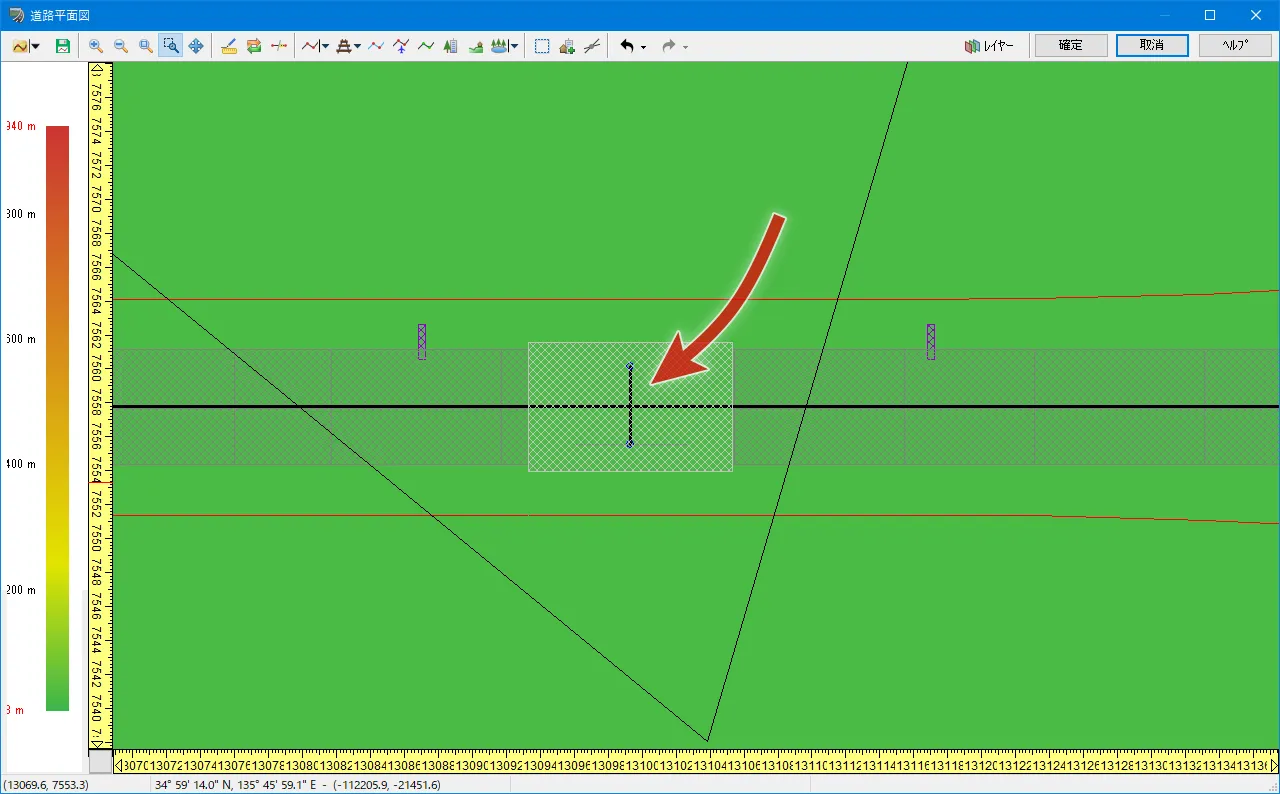 なお、見たい範囲がある程度定まっている場合は、マウスをドラッグして四角く囲むことで、すばやく拡大表示することができます。例えば、交差点を編集する場合や、細い道路中心線や飛行ルートをクリックしたいときなどは、囲んで拡大すると便利です。ただし、注意点として、何もない場所から囲み始めてください。うっかり方向変化点や頂点などをつかんでドラッグすると点が移動してしまいます。